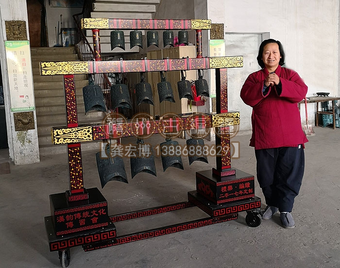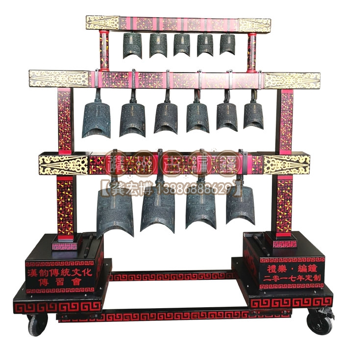 合肥漢韻文化傳習(xí)會(huì)定制的15件3層編鐘長(zhǎng)1.9米、高1.86米、寬0.5米,音律齊全,演奏使用方便,木架上可以彩繪客戶(hù)定制文字或圖案,底部安裝鋼制滑輪,安裝移動(dòng)都非常方便,配有樂(lè)器標(biāo)準(zhǔn)航空箱,外出表演得心應(yīng)手。