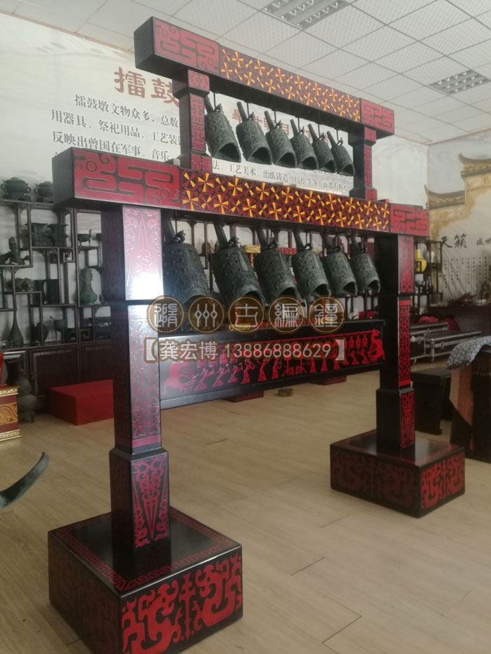 上??蛻舳ㄖ频?2件編鐘長2米、高2米、寬0.55米,分兩層懸掛了12件青銅編鐘,每件編鐘均可發(fā)出2個(gè)不同的樂音,半音齊備,采用A=440Hz標(biāo)準(zhǔn)調(diào)音,適合小型民樂團(tuán)體使用,豐富了民樂團(tuán)的整體音樂效果,從而獲得客戶的一致好評(píng)。